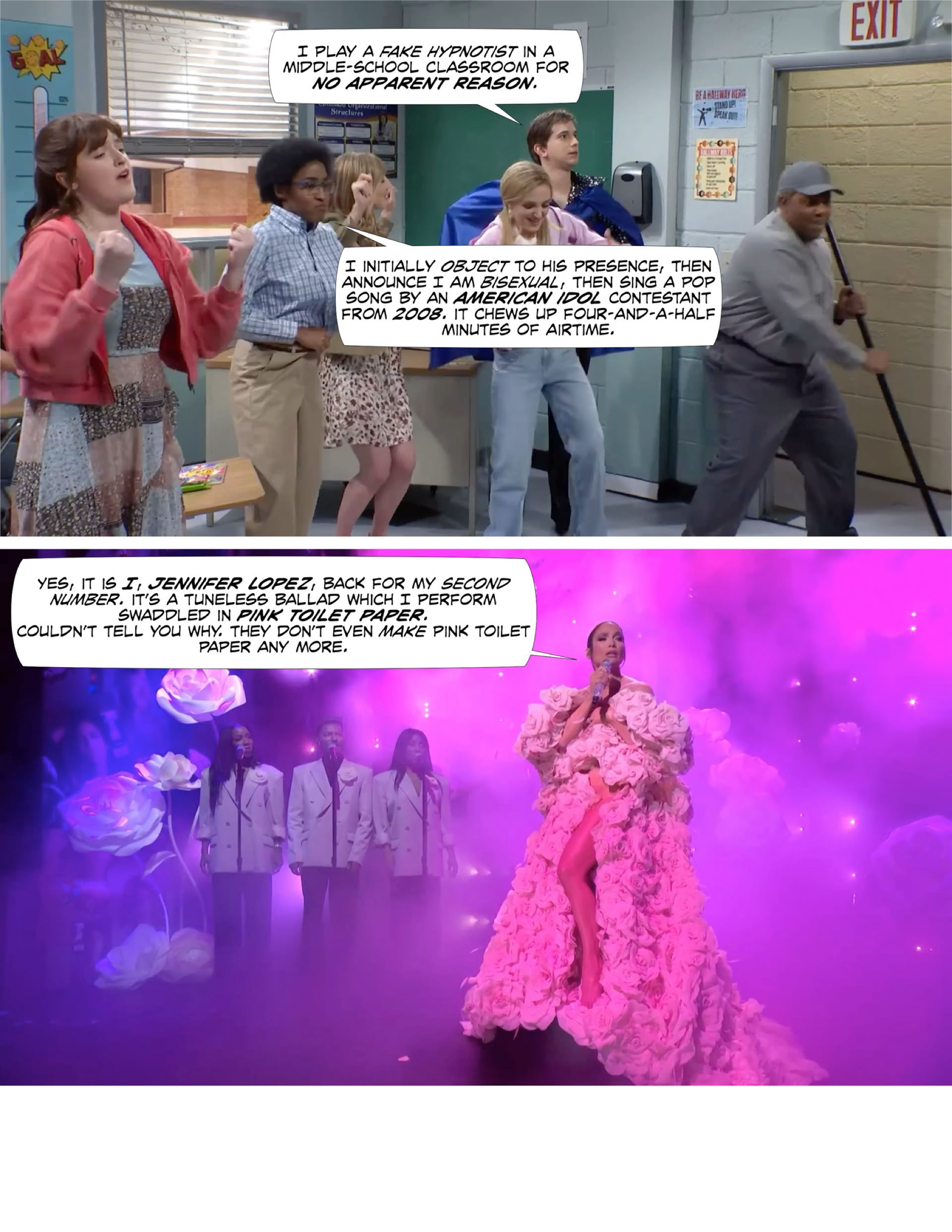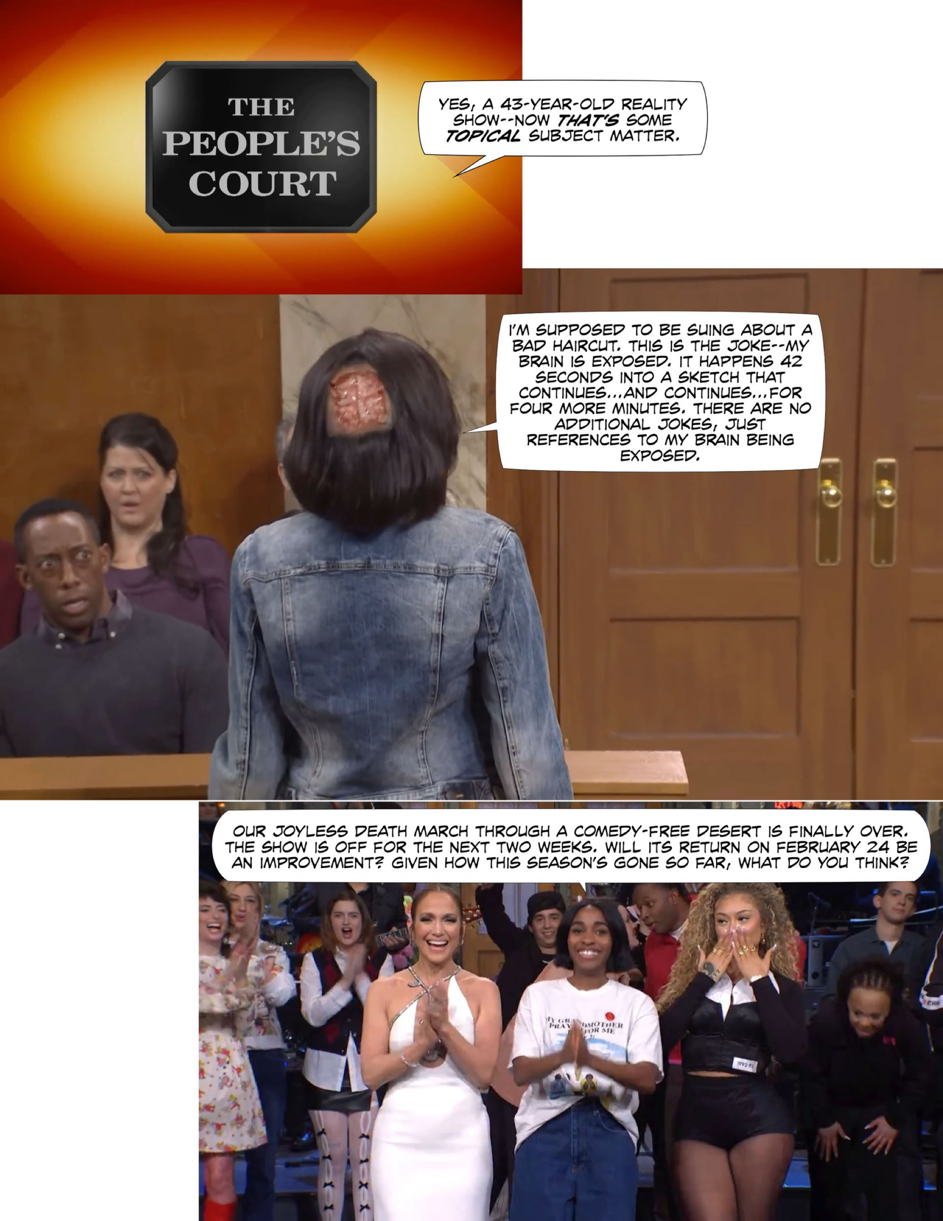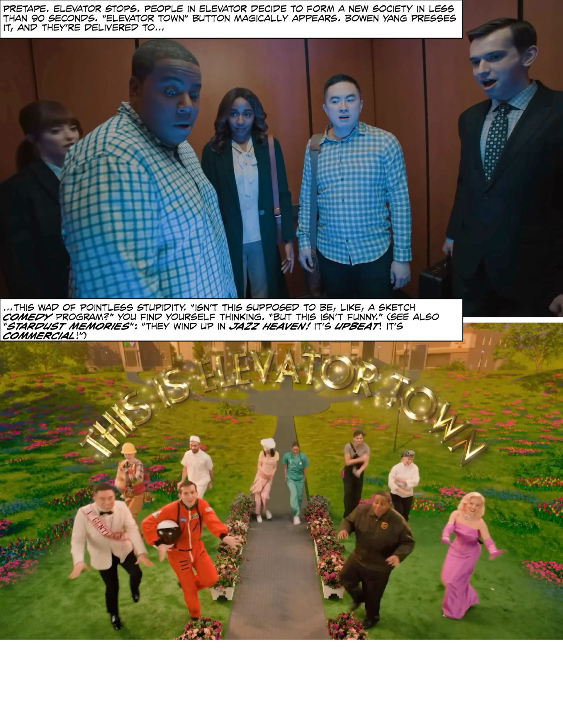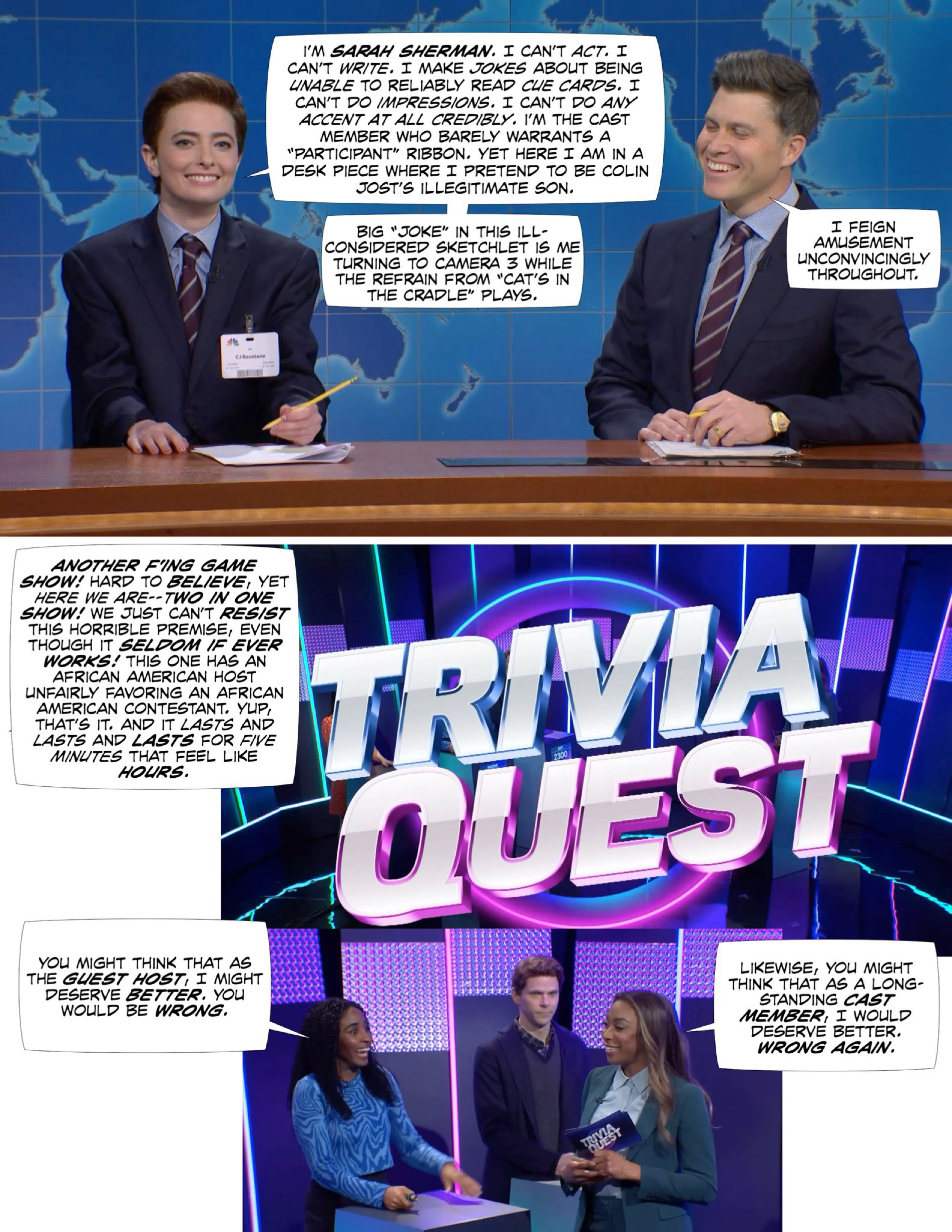 “Oh, it’s not funny. There aren’t any jokes. It’s, uh, Heidi’s secretary character finishing other characters’ sentences and then smashing a breakaway desk for no reason without any connection to anything in the script.”