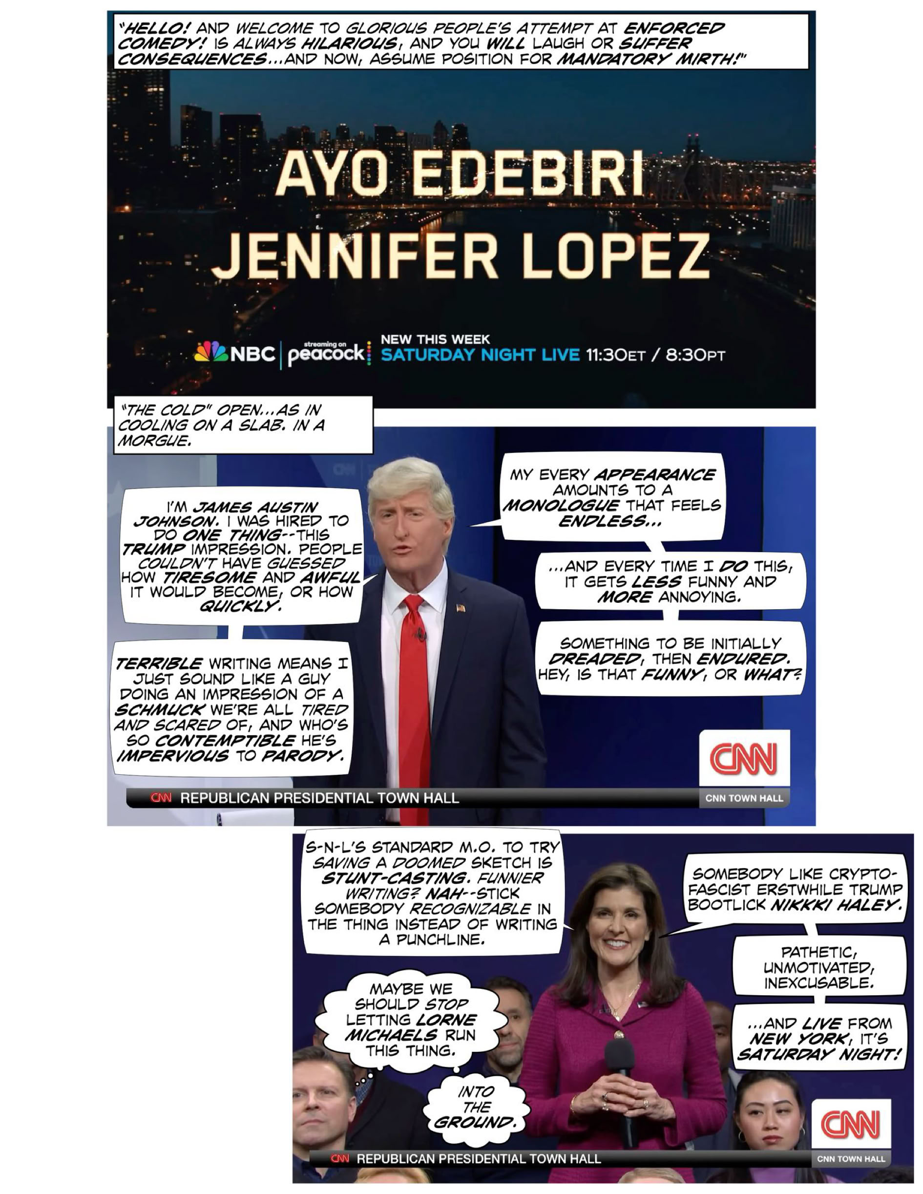 Is the problem some format straitjacket that constricts the process too much? Is it Lorne Michaels’s iron-clad authority and jaded, calcified inability to know what’s funny any more, rejecting everything but the lighter-than-air premise-free sketch excuses without punchlines that kill time between commercials? Has it been so long since Lorne (who is still credited as a writer) actually sat at a keyboard and banged out a sketch with a premise, characters, a beginning, middle and end that he’s forgotten how to do that? Is it like that